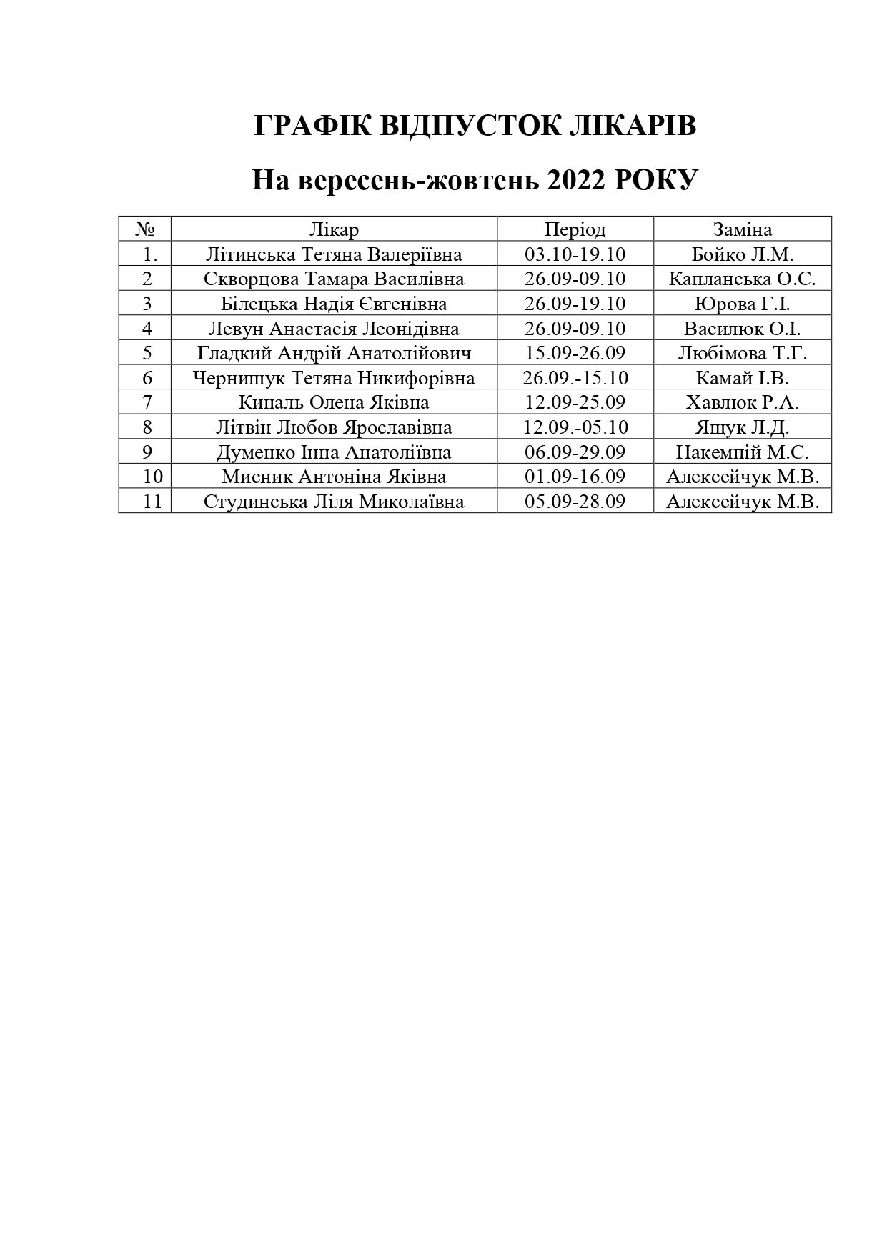 16.09.2022 Comments 0 Feedbacks on “ГРАФІК ВІДПУСТОК ЛІКАРІВ на вересень-жовтень 2022 РОКУ”Тимчасова заміна лікаря by Адміністрація ГРАФІК ВІДПУСТОК ЛІКАРІВ на вересень-жовтень 2022 РОКУ